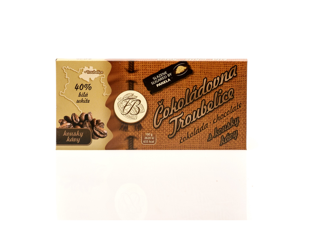 Čokoláda bílá 40% s KÁVOVÝMI ZRNY, 45 g, Čokoládovna Troubelice