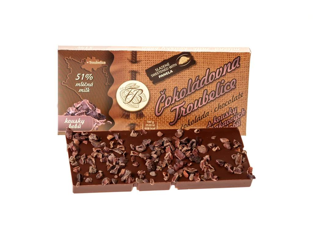 Čokoláda mléčná 51% s KAKAOVÝMI BOBY, 45 g, Čokoládovna Troubelice