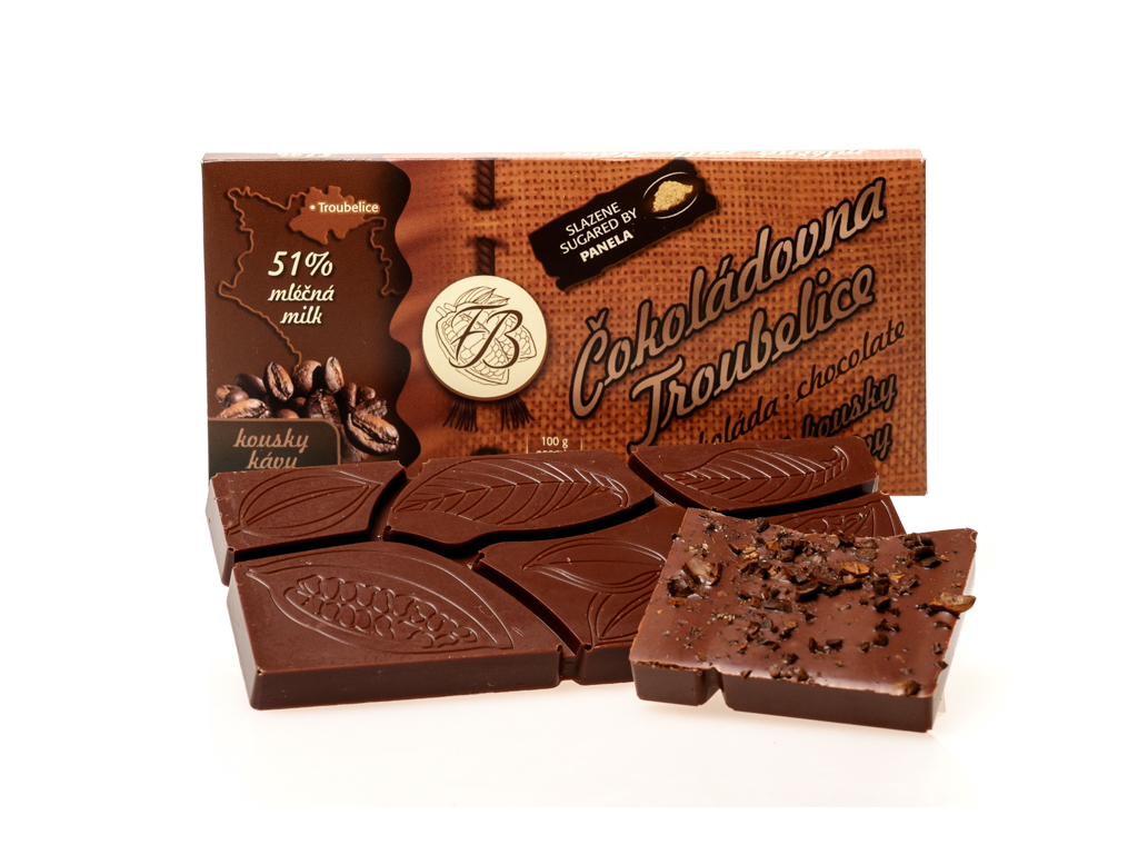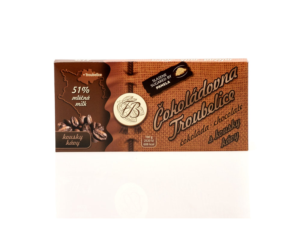 Čokoláda mléčná 51% s KÁVOVÝMI ZRNY, 45 g, Čokoládovna Troubelice