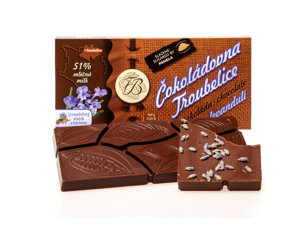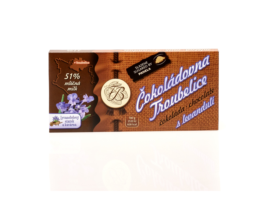 Čokoláda mléčná 51% s LEVANDULÍ, 45 g, Čokoládovna Troubelice