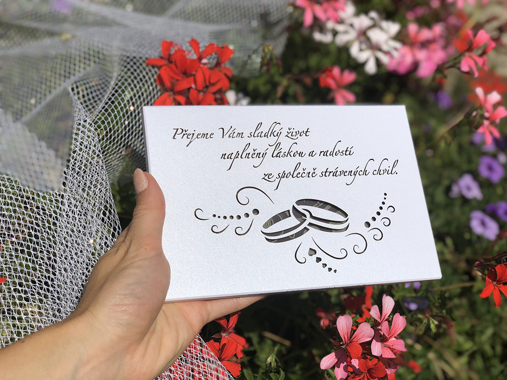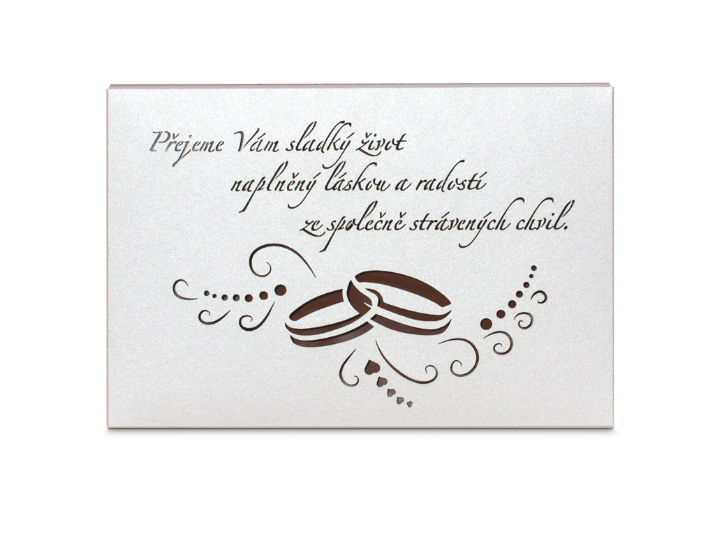 Krásný perleťový bílý obal s prstýnky a textem: "Přejeme Vám sladký život naplněný láskou a radostí ze společně strávených chvil."
