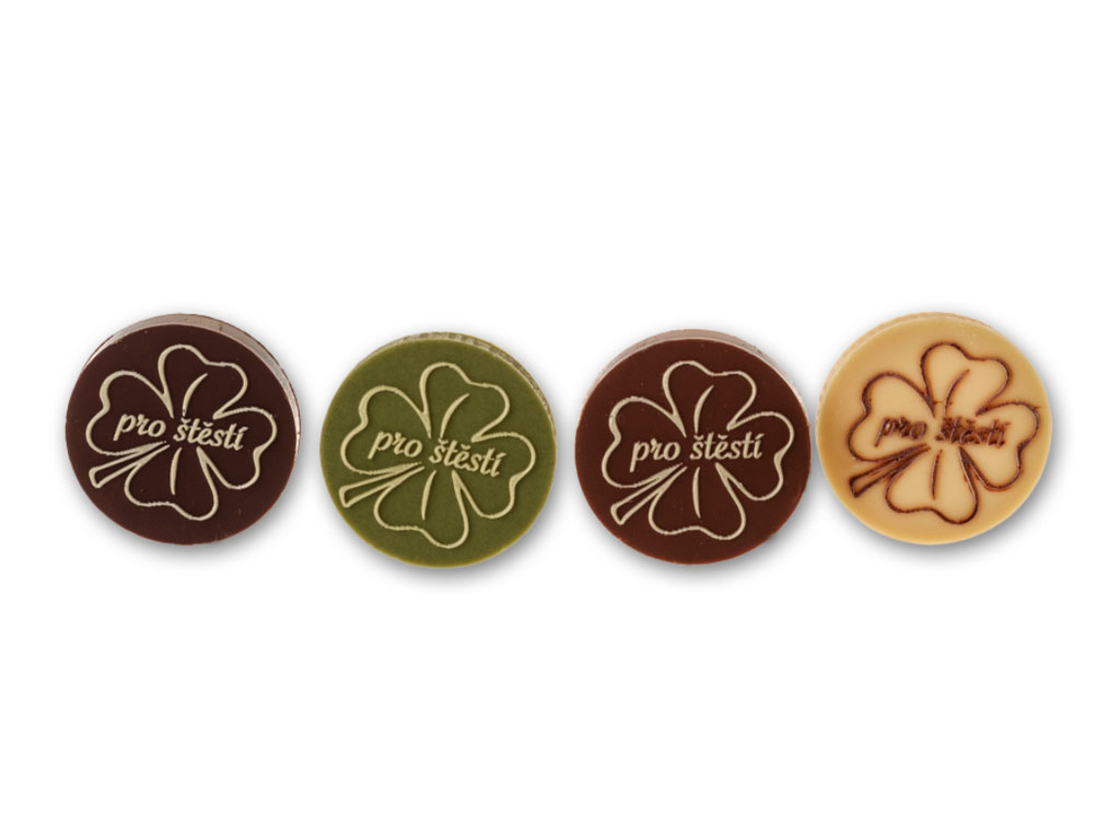 Čokoládové kolečko s reliéfem čtyřlístku.