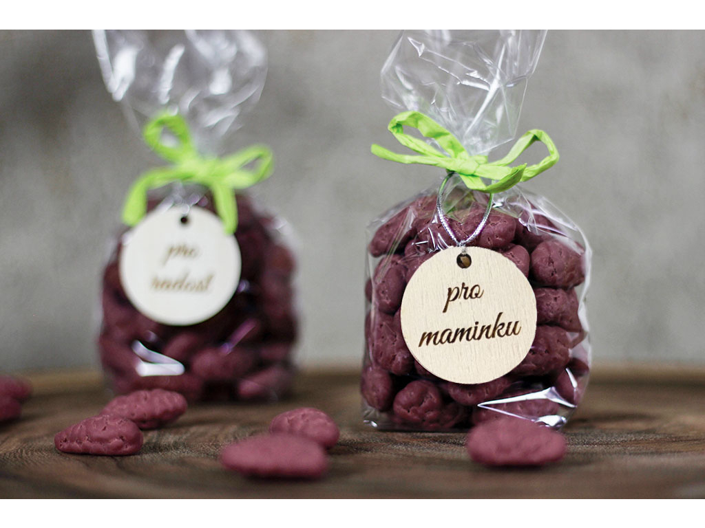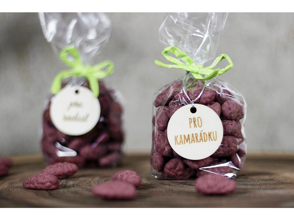 Dárkové balení křupavých mandlí obalených v růžové čokoládě s ibiškem.