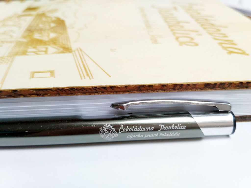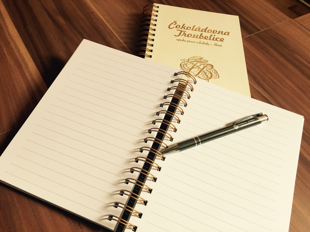 Luxusní blok s motivem kakaových bobů Čokoládovna Troubelice + propiska Čokoládovna Troubelice.
